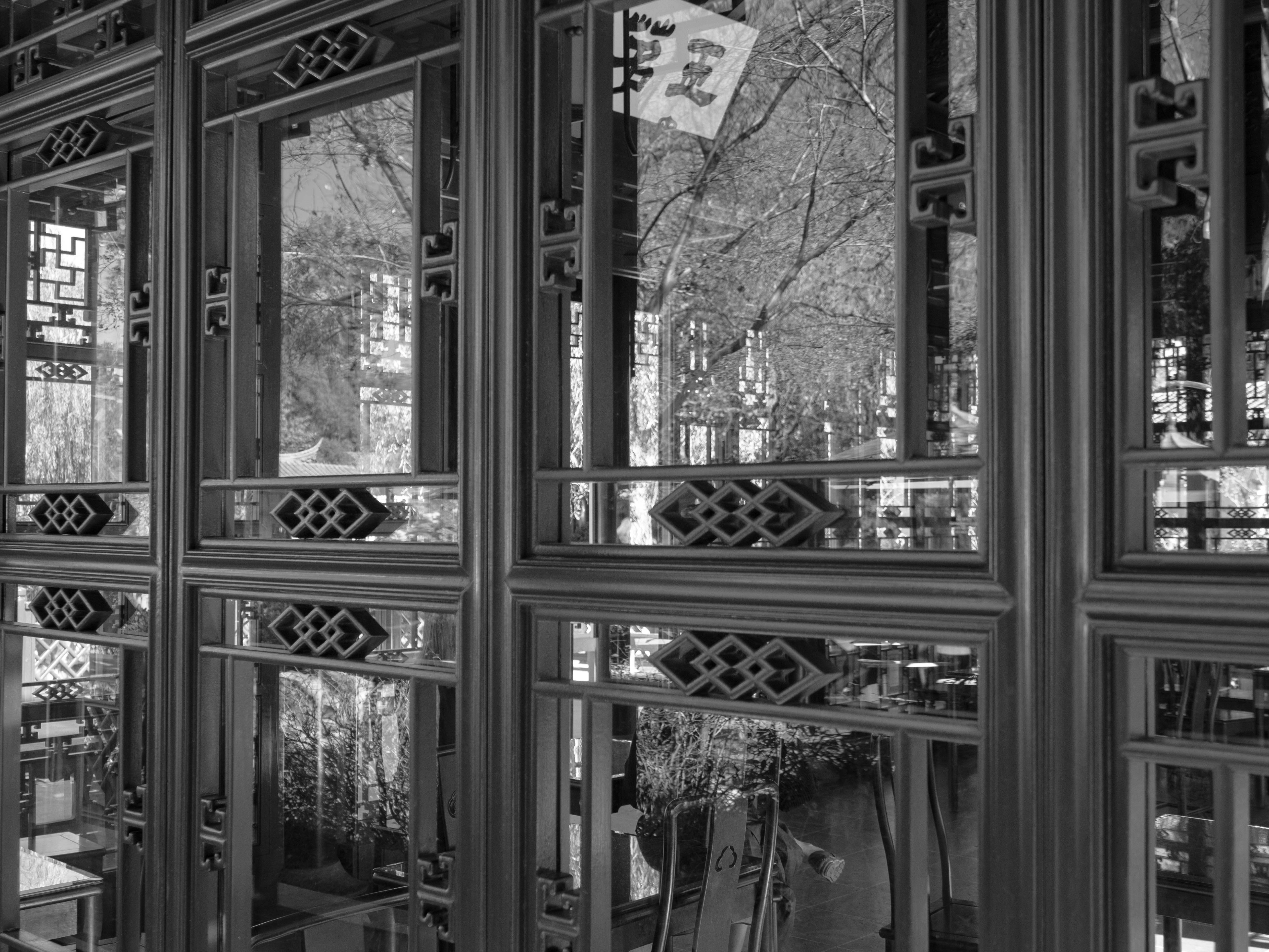 One of several Tea Houses in the Chinese Gardens at the Huntington Library. I was taken by the many reflections in the glass.